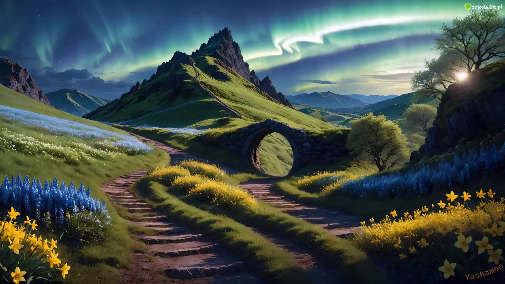 Zdjęcie Góry, Drzewa, Kwiaty, Zorza polarna, Grafika