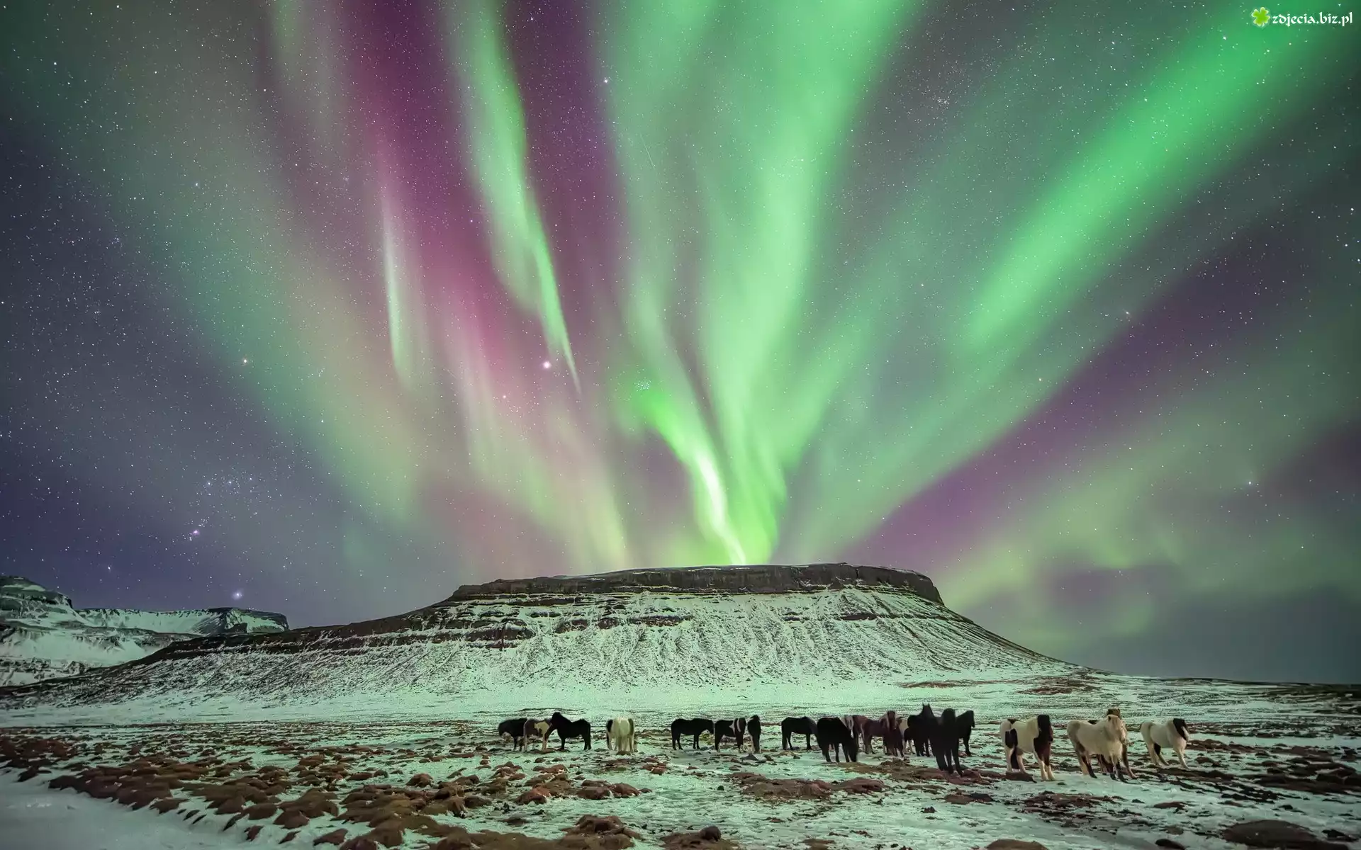 Zdjęcie Zorza, Polarna, Góry, Konie, Zima